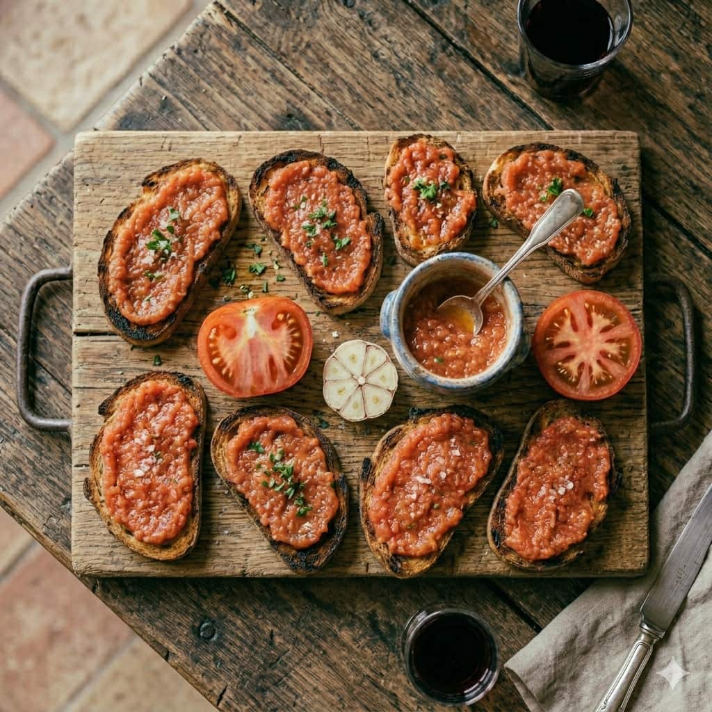 C’est la base. Pour 10 personnes, oubliez le frottage manuel sur le pain, passez en mode « efficace » grâce à ma version mixée (tomate + ail + huile) préparée à l’avance et tartinée au dernier moment.