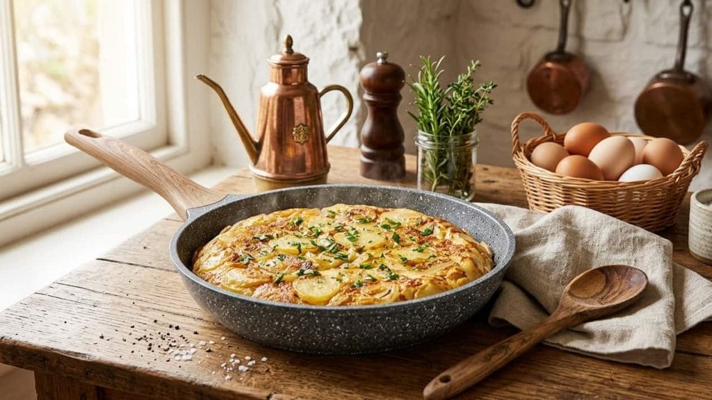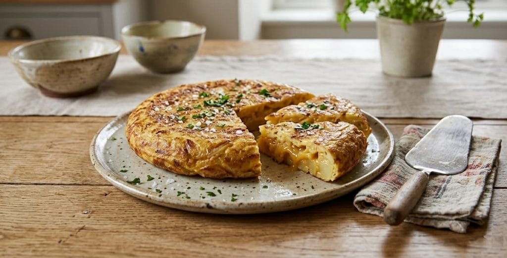 C’est le monument de la table espagnole. Oubliez l’omelette sèche : la vraie tortilla est généreuse, épaisse et cache un cœur intensément baveux. C’est le plat rustique par excellence qui, une fois posé au centre de la table dans une belle assiette, devient instantanément la pièce maîtresse du festin.