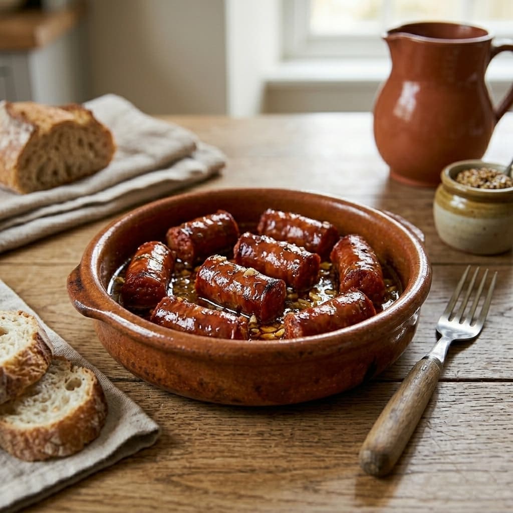 C’est la touche de peps qui réveille la fin de soirée. Cette petite saucisse fine, riche en pimentón fumé, apporte une intensité irrésistible à votre table. Si vous n’en trouvez pas, des chorizos frais à griller feront parfaitement l’affaire. Ici, tout se joue sur le déglaçage au vin blanc, qui crée un jus brillant balançant parfaitement le gras de la viande. C’est la tapa de terroir par excellence.